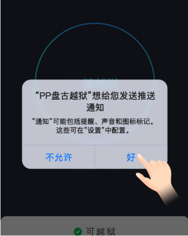 4、当系统提示【“PP盘古越狱”想给你推送通知】时,请点击【好】来允许推送