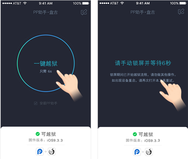 本次盘古越狱iOS9.2 – iOS9.3.3 越狱工具需要借助PP助手PC版软件,支持设备有iPhone5s、iPad mini2、iPad Air及以上设备等。
