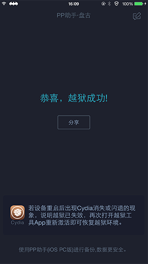 温馨提示 若设备在重启后出现Cydia消失或闪退的现象,说明越狱已失效,此时再次打开PP盘古越狱工具进行一次越狱操作即可恢复越狱。