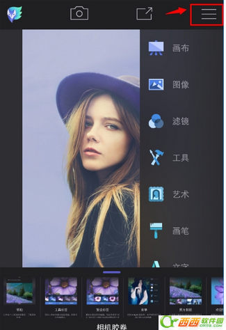 3、点击主页右上角的更多,即可看到画布、图像、滤镜、工具等等一系列图片处理的功能,用户可以根据自己的需求进行处理。