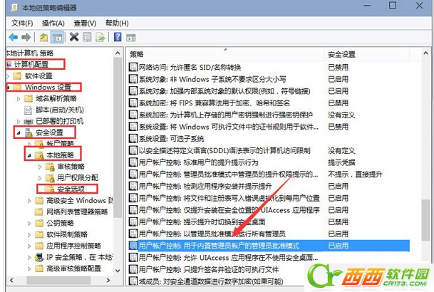 2、打开策略组之后,在右侧选项列表中,展开【计算机配置】—【Windows设置】—【安全设置】—【本地策略】—【安全选项】;