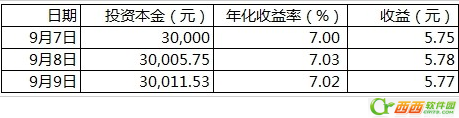 9月7日获得的收益5.75元,与当日投资本金30,000元之和作为9月8日的投资本金进行再投资。以此类推。