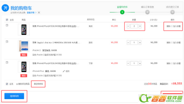 2.查看购物车: 将商品放入购物车后,页面自动进入购物车,或点击导航右侧的“购物车”,查看所选购的商品。