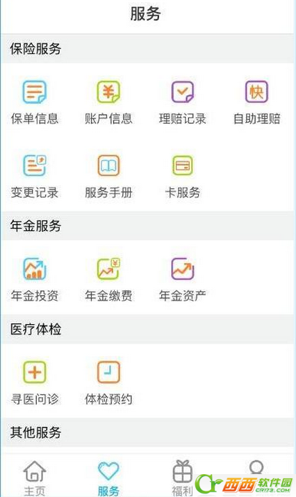 3、进入服务页面后,主要包括保险服务、年金服务、医疗体检等功能。