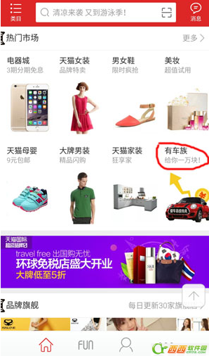 1、打开天猫、淘宝点击进入首页的热门市场“有车族”