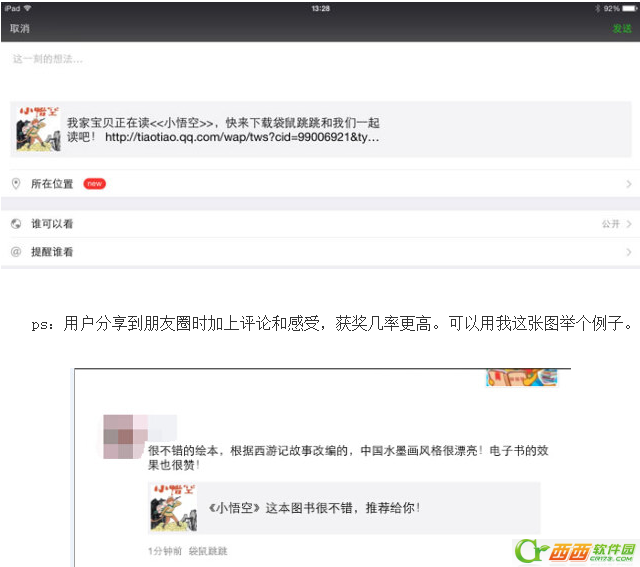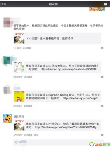 在袋鼠跳跳app中,给孩子读一本书,并发现还不错的时候,将它分享到微信朋友圈,跟更多的朋友一起分享阅读的乐趣!