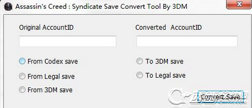 大致的使用方法,以3DM破解版存档转某位正版玩家用的存档为例,先选上“From 3DM save”和"To Legal save"这2个选项,然后在“Orignal AccoutID”内填入你3DM破解补丁saves.ini文件里的AccoutID(默认是3DMGAME,这个建议大家不要修改,如果要修改游戏里显示的用户名,请修改PlayName=3DMGAME即可,AccoutID没事不要乱改,谢谢配合!),然后"Coverted AccoutID"里填入你正版的Uplay安装目录下的这个文件夹内的Program Files (x86)\Ubisoft\Ubisoft Game Launcher\cache\ownership 那个类似这样的文件名68618263-d3ca-42dc-31e6-809d1d10e23a,这个68618263-d3ca-42dc-31e6-809d1d10e23a就是你正版的AccoutID,然后点"Coverted Save",这时你选择存档文件,你选择一个3DM破解版的扩展名为save的存档文件,转换就会成功,然后放到正版的存档目录,默认是你的uplay安装目录,类似Program Files (x86)\Ubisoft\Ubisoft Game Launcher\savegames\68618263-d3ca-42dc-31e6-809d1d10e23a\857