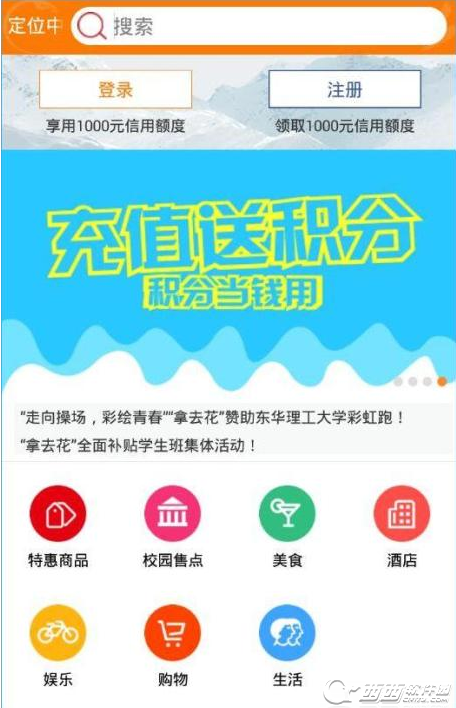 1、打开软件即进入到主页面,在这里,你可在登录和注册帐号,同时还为你推荐特惠商品、校园售点、美食、酒店、娱乐、购物及生活版块让用户进行选择性消费。