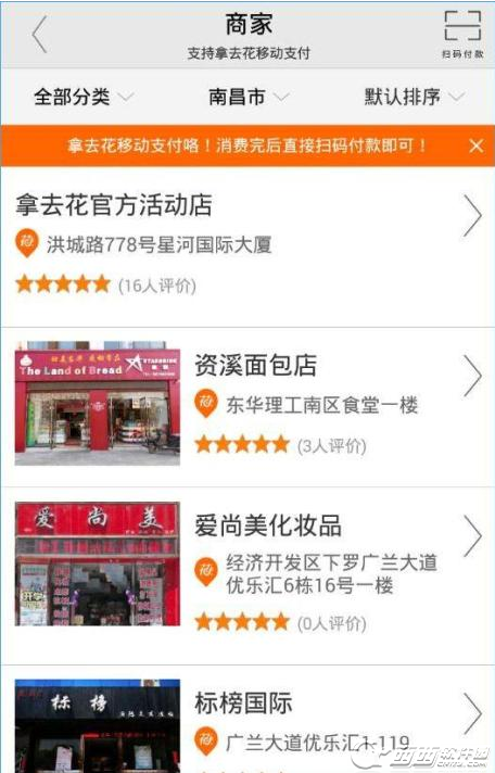 3、点击商户页面,在这里你可以看到所有支持拿去花移动支付的商家信息