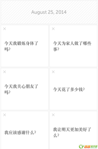 格 志日记与其他日记最大的不同在于它是将一天分成若干个问题格子,通过回答这些问题,来记录这一天中最重要的事件以及体会。问题的设计应该具体明确,不应过 于宽泛,这样回答起来也会更有效率。以前惧怕日记是因为不知道从何写起,而现在用问答来回顾自己的一天,可以更直接更有效地反观自己。