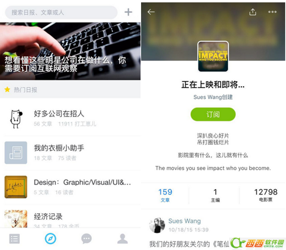 用户可以在“发现”Tab中寻找自己感兴趣的主题日报,同时,也可以通过顶部搜索功能找到喜欢的用户、日报。在订阅了主题日报后,日报的更新动态会在首页实时显示,帮助用户以最快的速度了解日报讯息。而在关注了其他用户以后,可以借此查询该用户订阅的主题日报,发布的文章,关注的人以及关注者,以此建立了其用户之间的社交网络。
