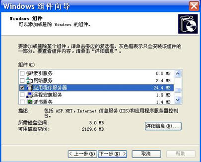 打开“控制面板”→“添加/删除程序”→“添加删除Windows组件”→“选中应用程序服务器”→单击“下一步”即可(如图1)。如果安装过程中有任何提示,都选择继续安装就可以了。