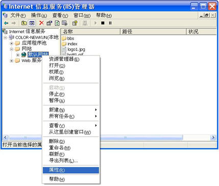 接下来,展开IIS管理器左侧边栏树状目录,右键单击“默认网站”,选择“属性”(如图2)。