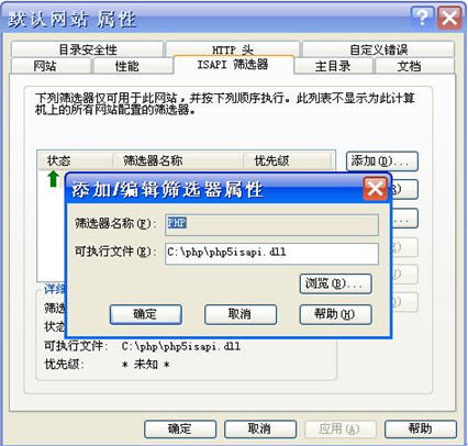 然后选择“ISAPI筛选器”标签,单击“添加”安钮。在弹出的对话框中输入筛选器名称为PHP,再单击“浏览”,选择可执行文件为C:\php\php5isapi.dll,单击“确定”(如图3)。