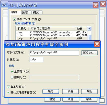 接下来再选择“主目录”标签,单击“配置”按钮,在弹出的对话框中选择“添加”,可执行文件还是C:\php\php5isapi.dll文件,扩展名为.php,然后单击“确定”即可(见图4)。