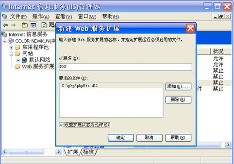现在,再回到IIS管理器的左侧边栏树状目录,右键单击“Web服务扩展”,选择“添加一个新的Web服务扩展”。在弹出的对话框中输入扩展名为PHP,然后单击“添加”按钮,选择“浏览”,添加要求的文件为C:\php\php5ts.dll 文件,并勾选“设置扩展状态为允许”(如图5),单击“确定”即完成PHP在IIS环境下的安装。