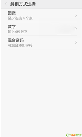 接下来我们会进入到小米手机解锁方式选择界面,有:图案、数字、混合密码三种方式设置