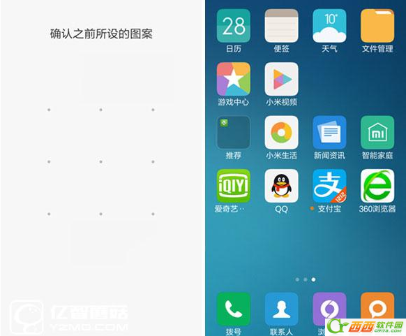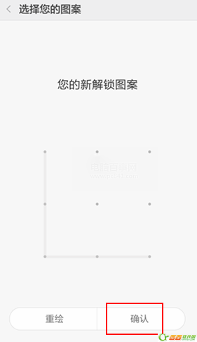 西西小编选择【图案】解锁方式。再接下来在【图案密码】设置界面中,连续输入两次图案密码,最后点击【确认】即可以完成密码锁定设置操作