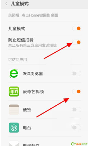 再接下来我们返回到儿童模式设置界面之后,我们需要对【扣费短信】和【可访问应用】进行相关设置,如图所示,在此可以根据自己的需要进行有选择性的限制。