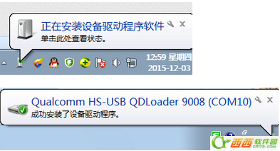 当正确安装了“MiFlash20160601”版本的线刷工具后,当小米4LTE进入“刷机”模式时,任务栏将显示“Qualcomm HS-USB QDLoader 9008”设备驱动安装成功的提示信息。