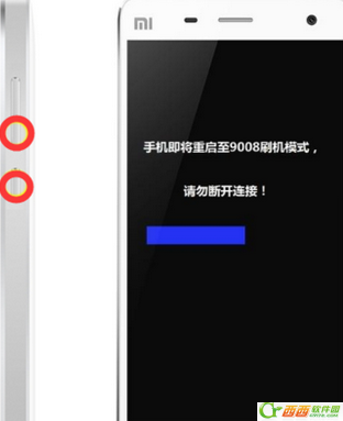 接下来在小米4完全关机的情况下,长按【电源键】+【音量下键】使手机重新进入9008刷机模式,此时再将小米4手机和电脑进行连接。