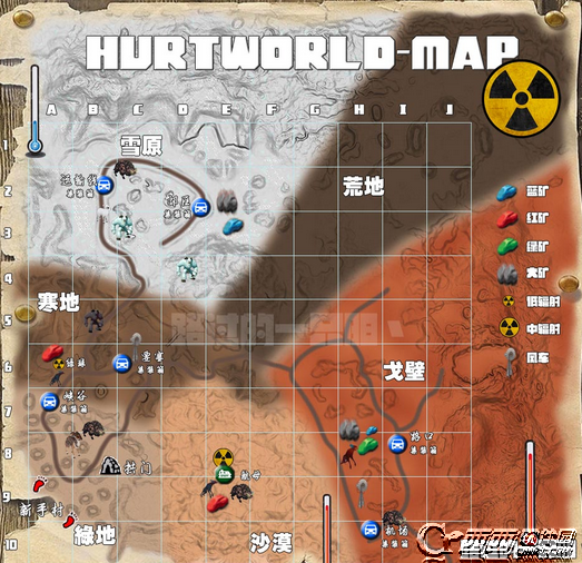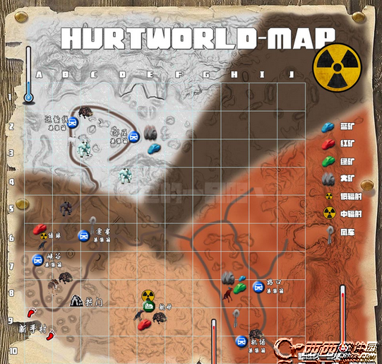 增加了各色矿石的位置及标注,集资箱、新手村、拱门、辐射点、航母位置做了图片文字说明,最主要增加了温度标记!