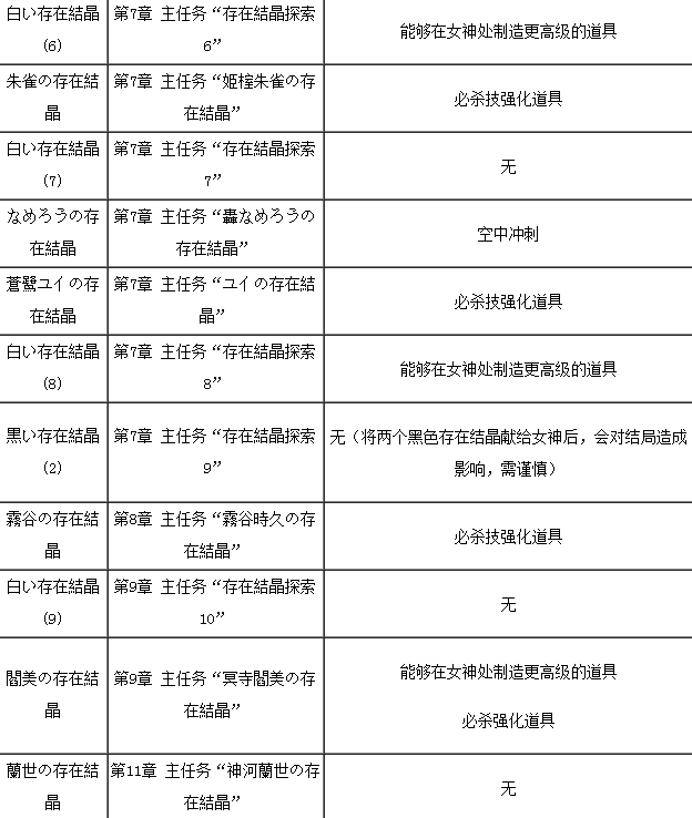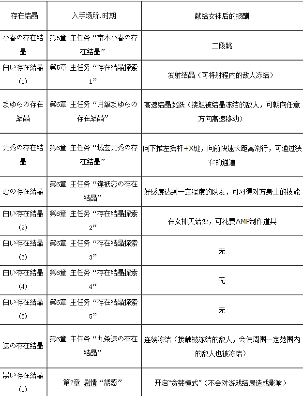 初次入手存在结晶是在第五章的主任务中。随后主要在游戏流程中的主任务中入手。将存在结晶献给女神天诘,不仅有机会得到珍贵道具,还能解锁二段跳、发射结晶等动作,帮助玩家到达以前迷宫中无法到达的地方。