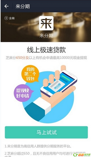 按照官方给出的解释是这样的:来分期是为最高信用人群提供分期服务的平台,只要你的芝麻信用分超过650分即可快速获得现金贷款。从也官方给出的解释我们不难得知,其实来分期是趣分期和支付宝合作推出的一款信用贷款产品,只要用户的芝麻信用分达到了650分即可申请贷款,用户分期付款来消费,跟花呗、借呗差不多的用途。
