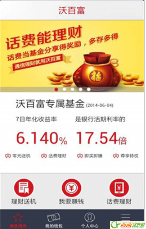 沃百富是广东联通与百度、富国基金携手合作,面向新老用户提供的首款通信理财产品,目前主要业务有话费理财、理财送机、以及互联网理财,沃百富致力于为用户带来全新的通信产品消费方式和理财投资收益方式,实现基于手机号码的随时随地理财和生活服务。把资金转入沃百富即购买了富国富钱包货币基金,沃百富收益率随市场资金利率波动,理论上存在亏损可能,但从历史数据来看收益稳定,风险极小。