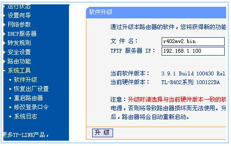 升级的目的是使TL-R402具备IP带宽控制功能,能自由分配内网用户带宽。