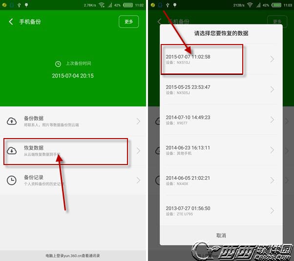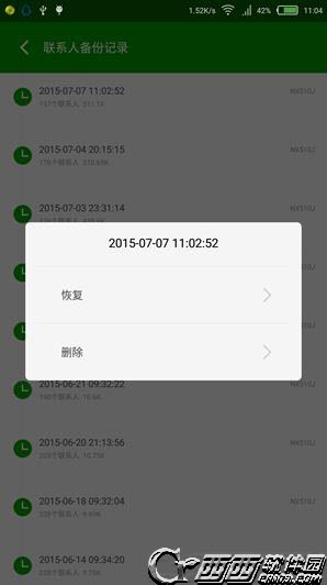 第四步,恢复备份,点击恢复,然后可以看到各个设备的最后一次备份记录,点击其中的一个,进行恢复