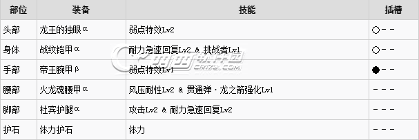 通过「弱点特效」「攻击」「挑战者」与「龙之箭强化」等技能来提高火力,再靠「体术」与「耐力急速回复」来减少耐力的消耗。剩下的槽可以加入攻击等装饰品。