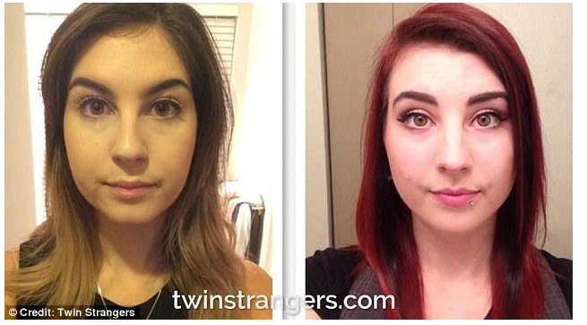通过“陌生双胞胎”(TwinStrangers.com)网站,美国得克萨斯州33岁的女子詹妮弗(Jennifer)找到了与自己一模一样的人,即来自北卡罗来纳州23岁的安布拉(Ambra),两人见面时都因极其相像的面貌而震惊了。