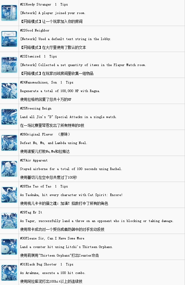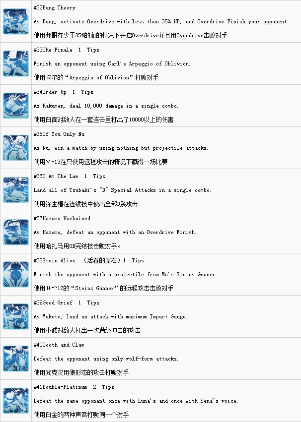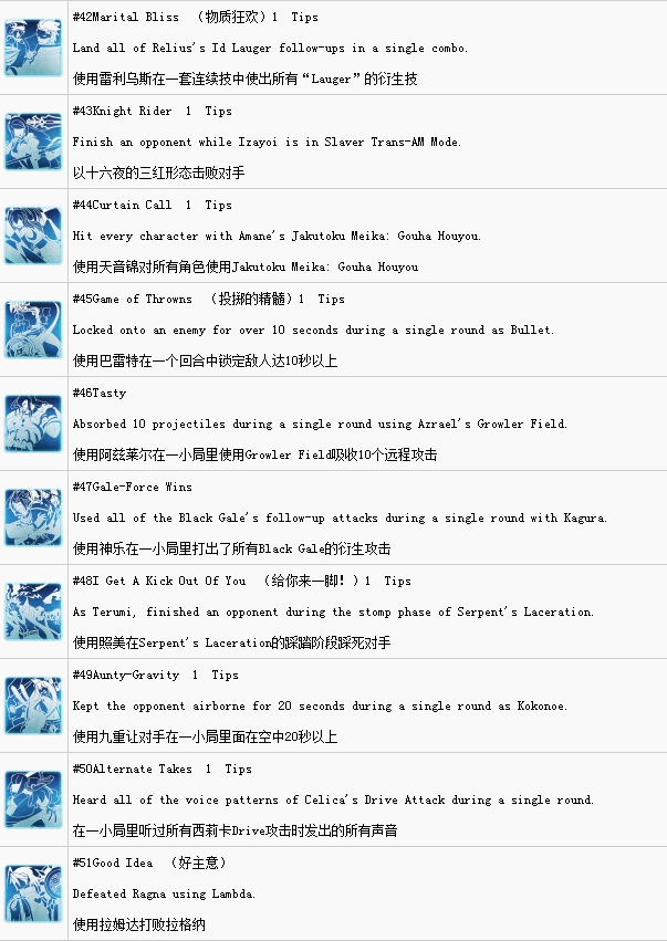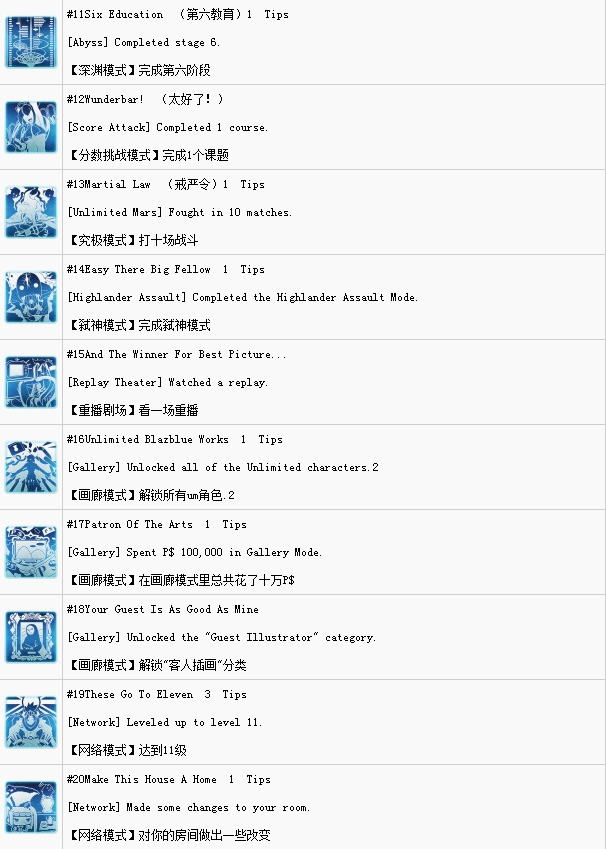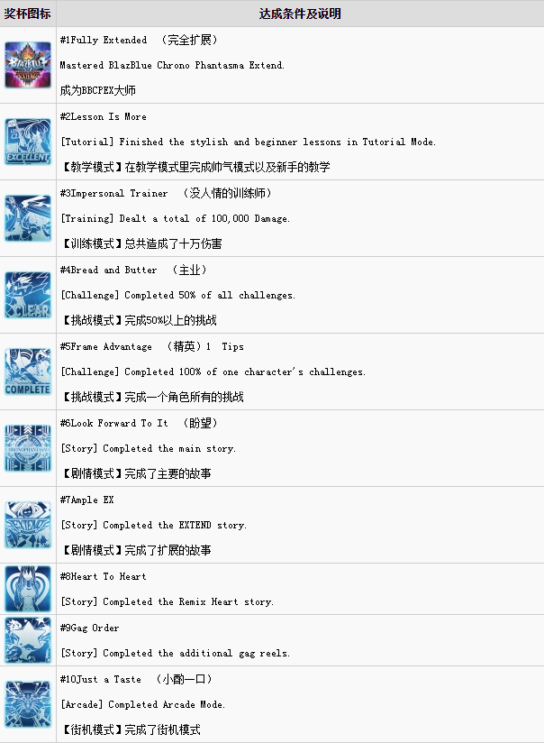 《苍翼默示录:刻之幻影扩展版》由日本Arc System Works公司推出的超人气游戏《苍翼默示录:刻之幻影》的增强版,新增了人物和剧情。同样,游戏也有奖杯系统,对于执着于奖杯成就的玩家来说是时候展现展现正真的技术了!下面为大家带来奖杯的达成条件。