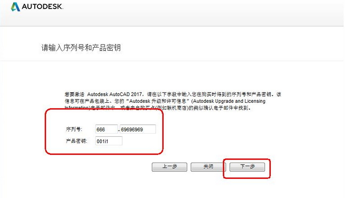 6.将上一步得到的“激活码”复制到AutoCAD 2017激活界面中,点击下一步即可完成激活!