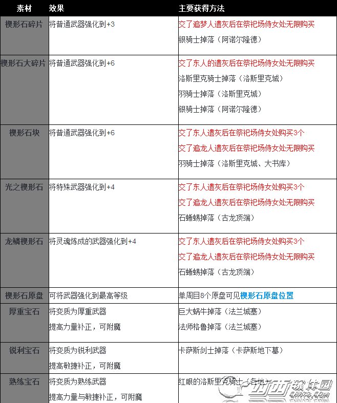 本作中除了楔石原盘以外所有的强化素材都是可以刷敌人掉落的,其它的素材因为能捡的地方太多了,只说掉落敌人与可购买的地方。(结晶蜥蜴掉落的光之楔形石、龙鳞石等素材忽略)