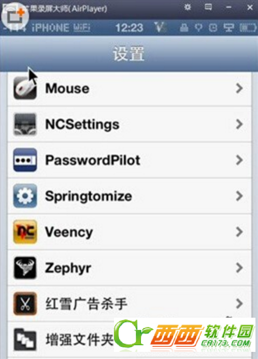 2、安装完毕进入设备的设置,下拉,可以在越狱插件设置列表里找到两个新增的,分别是“MOUSE”和“VEENCY”。“MOUSE”很明显,是用来设置我们用来控制IOS设备的鼠标的,如果不设置的话,默认是左键触摸,右键HOME。基本的应用是足够了;VEENCY则更简单,进入后设置一个自己好记的密码就行了,一会儿和电脑建立连接时候我们要用到。
