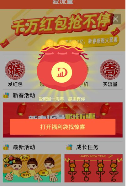 首先点击本页面中的爱流量客户端下载,安装成功之后,就可以进入到爱流量一周年福袋活动,打开福袋登录账号就可以领取20m流量。