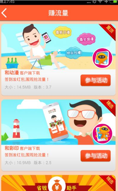 以下载应用抢流量为例子,进入之后,点击参与活动,比如下载和动漫app签到就可以领取流量红包!