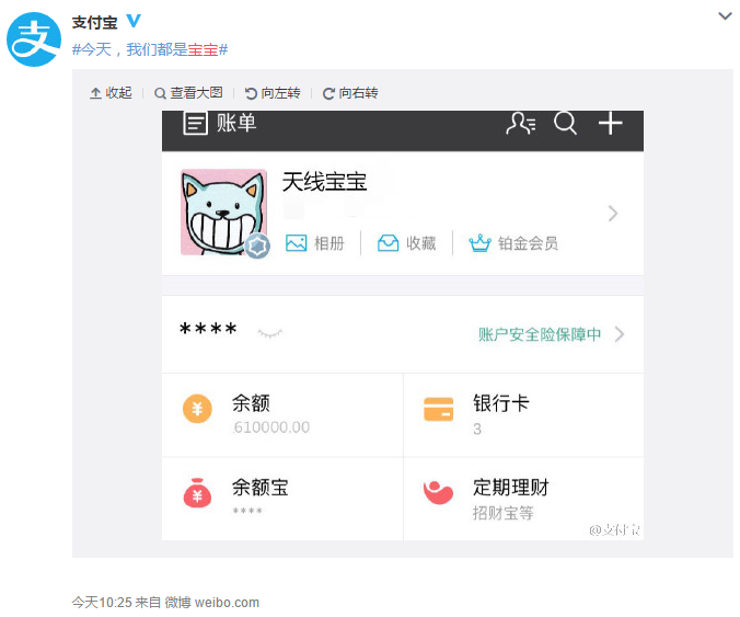 支付宝为了庆祝六一儿童节,也为了让网友有一个童心,偷偷给大家卖了个萌,把昵称后面加了个宝宝,大家都成了XX宝宝。
