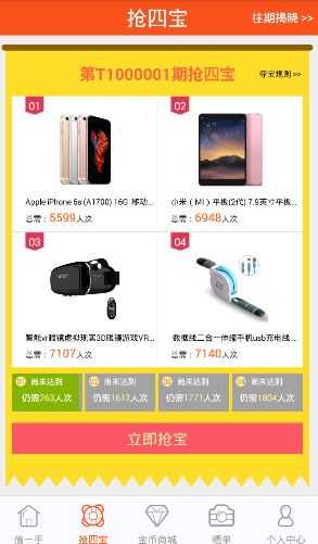 登录进入到偷偷帮软件中,然后点击抢四宝按钮,如上图所示,可以看到相应的商品,点击立即抢宝;