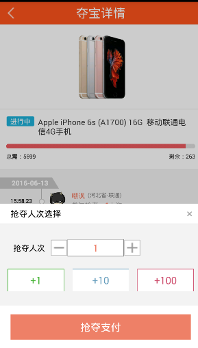 然后需要选择夺宝的人数,一就代表只有一个号码,支付一元钱,10就是10元,获得10个号码,100就是100个号码,支付100元,自己选择之后去支付就可以了!