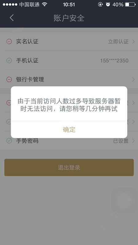 1、相信很多朋友打开铂诺理财app时系统都会反复提示“当前访问人数过多导致服务器暂时无法访问,请您稍等几分钟再试”,点击“确定”之后还是会出现这样的提示;