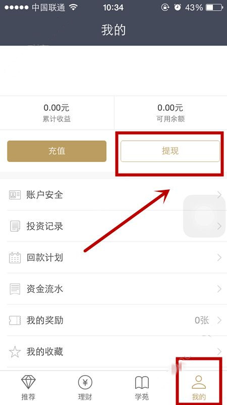 1、打开铂诺理财app,在“我的”中选择“提现”按钮,然后输入你想提现的金额后点击“提交”就能够提现成功了哟;