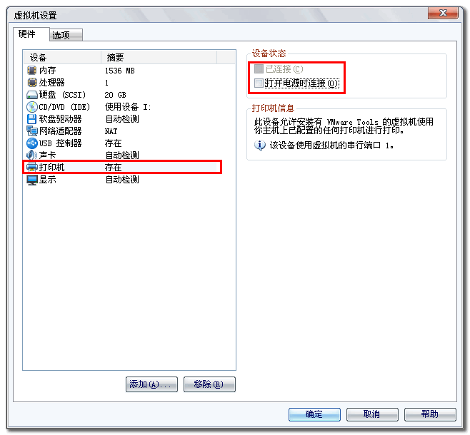 这是因为vm7.01默认是开启打印机. 那么只要把虚拟机的打印设备关掉就可以了.
