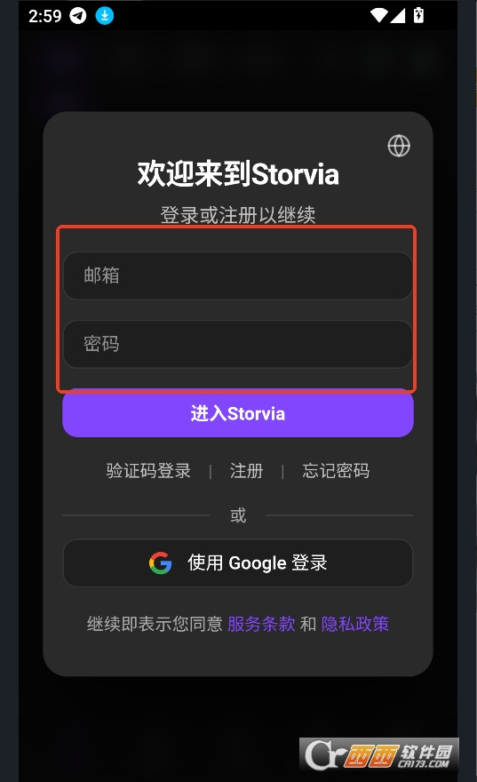 1、首先在手机上下载安装Storvia,打开应用后进入登录界面。