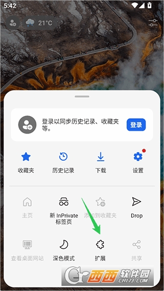 1、以手机版Edge Canary为例,进入Edge Canary安卓版后点击右下角的扩展功能图标(下图绿色箭头所指处)