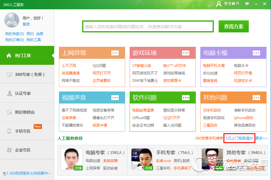 专家上门维修:专家上门解决电脑问题,让您在家、公司或附近咖啡馆,就能轻松享受服务。更有专业电脑清灰服务,17种专业工具,24道企业级清灰工序,全面清除灰尘,为电脑提速和降温,延长电脑硬件寿命。