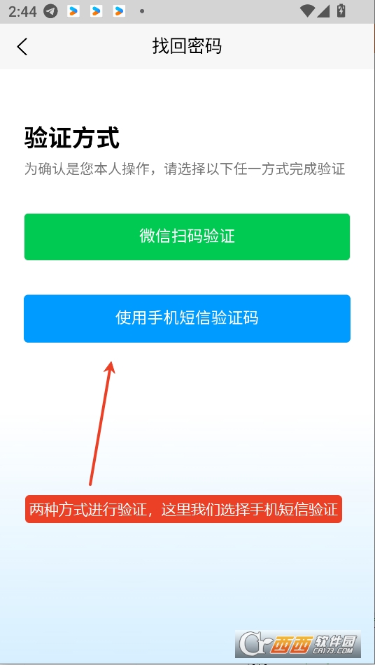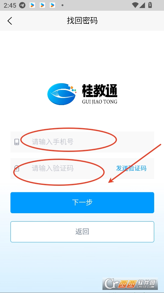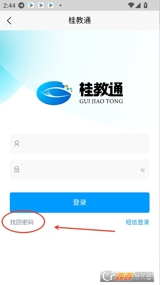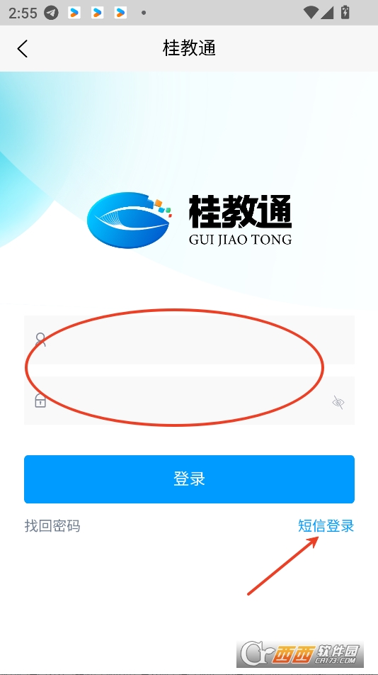 在西西软件园下载安装桂教通app,打开软件进入首页,点击短信登录