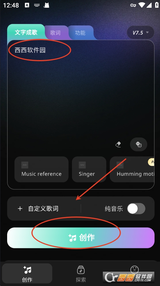 你可以输入你需要的关键词,相关的文字,点击创作,还可以自定义歌曲